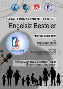 3 Aralık Dünya Engelliler Günü kapsamında üniversitemiz Devlet Konservatuvarı öğretim üyesi Doç. Yıldırım AKTAŞ’ın hazırlayıp sunduğu Güne Özel – “Engelsiz Besteler” isimli Radyo Söyleşi/Müzik Programı 3 Aralık 2025 Perşembe günü saat 14:00’te Radyo Kocatepe’de.
