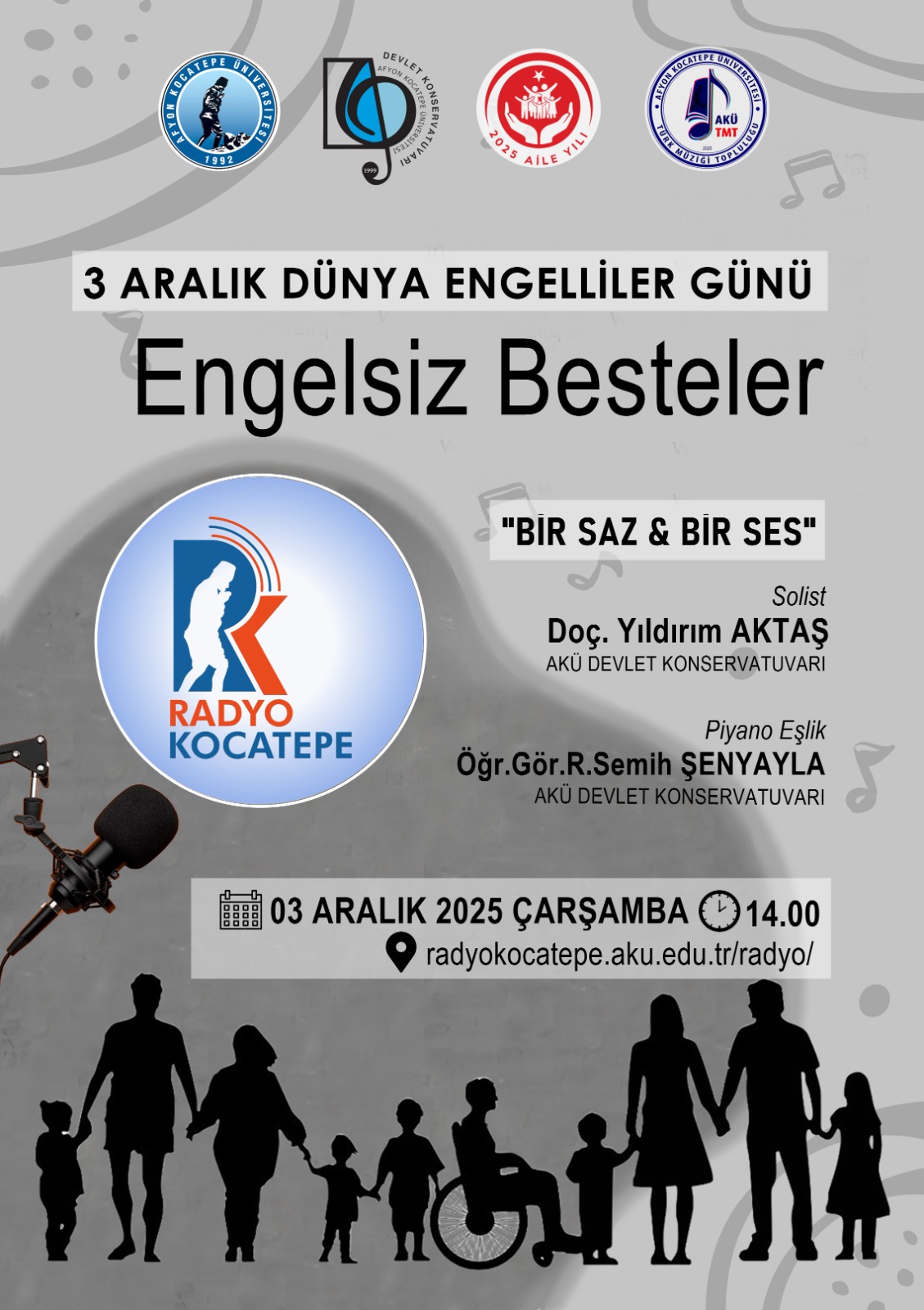 3 Aralık Dünya Engelliler Günü kapsamında üniversitemiz Devlet Konservatuvarı öğretim üyesi Doç. Yıldırım AKTAŞ’ın hazırlayıp sunduğu Güne Özel – “Engelsiz Besteler” isimli Radyo Söyleşi/Müzik Programı 3 Aralık 2025 Perşembe günü saat 14:00’te Radyo Kocatepe’de.