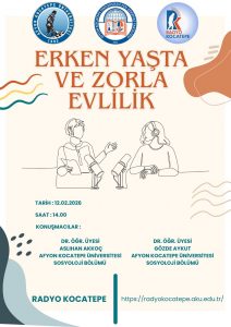 Afyon Kocatepe Üniversitesi Fen Edebiyat Fakültesi Sosyoloji Bölümü öğretim üyeleri, Dr. Öğr. Üyesi Aslıhan AKKOÇ ve Dr. Öğr. Üyesi Gözde AYKUT tarafından hazırlanan  “Erken Yaşta ve Zorla Evlilik” konulu radyo söyleşi programı 12 Şubat 2026 Perşembe günü saat 14:00’te Radyo Kocatepe’de yayımlanacaktır.