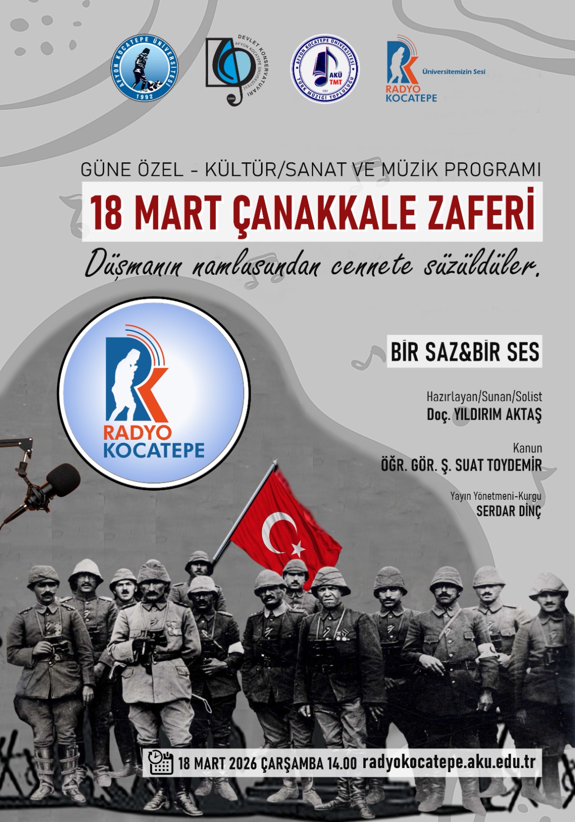 18 Mart Çanakkale Zaferi Anma Programı kapsamında, üniversitemiz Devlet Konservatuvarı Öğretim üyesi Doç. Yıldırım Aktaş’ın hazırlayıp sunduğu ve solistliğini yaptığı, Öğr.Gör. Ş.Suat Toydemir’in Kanun ile eşlik ettiği, yayın yönetmenliğini ve kurgusunu Serdar Dinç’in üstlendiği “Güne Özel – 18 Mart Çanakkale Zaferi” isimli radyo söyleşi/müzik programı 18 Mart 2026 Çarşamba günü saat 14:00’te Radyo Kocatepe’de.